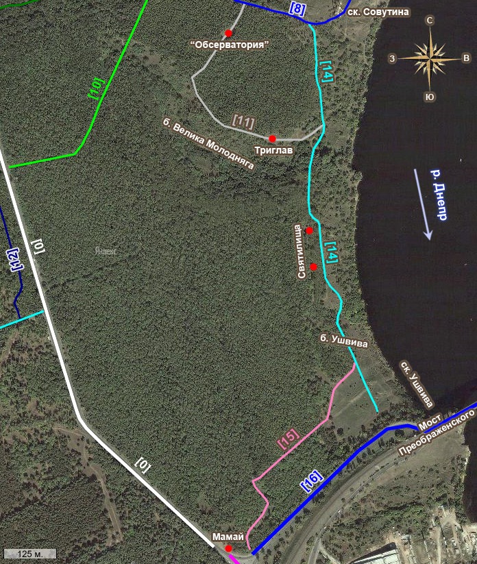 Перейдя мост Преображенского и ступив на землю Хортицы, вы можете заметить, что справа от дороги [16] ближе к мосту находится крутой спуск, местами переходящий даже в обрывы. Пройдя около 100-200 метров далее, вы заметите, как этот спуск справа от дороги постепенно становится более пологим, и здесь уже появляются небольшие тропинки-спуски, соединяющие дорогу [16] с живописной лесной тропинкой [15].